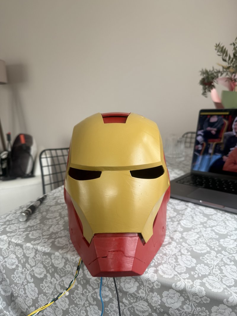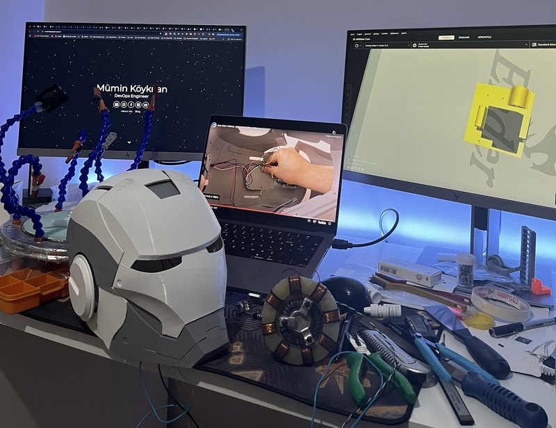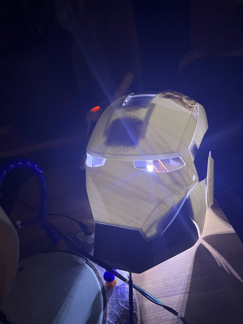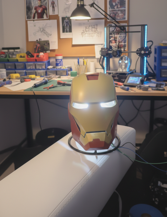 Tam fonksiyonel bir Iron Man kaskı yaptım: Arduino Nano kontrollü servo mekanizması ile otomatik açılan yüz maskesi, tamamen el yapımı LED göz sistemi (eski bir ampulden çıkardığım LED’lerle!), dimmer ile ayarlanabilir parlaklık kontrolü ve profesyonel yüzey işleme teknikleriyle elde ettiğim metalik kırmızı-altın renkleri.