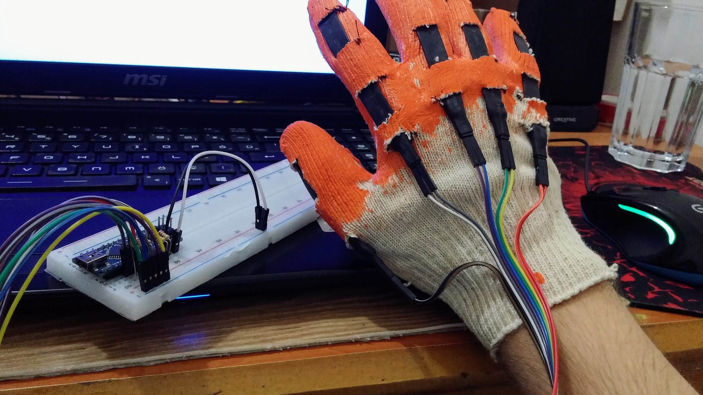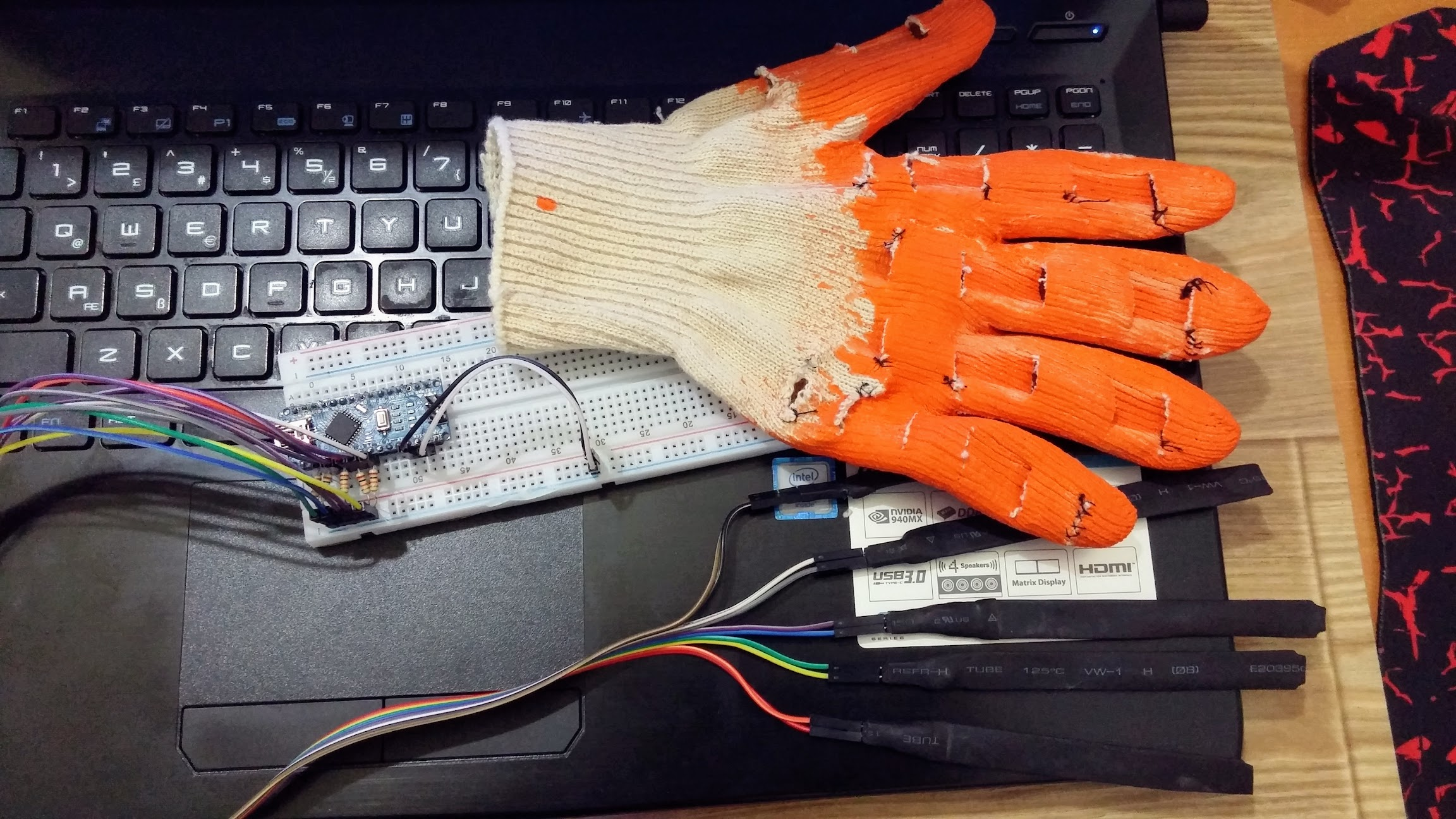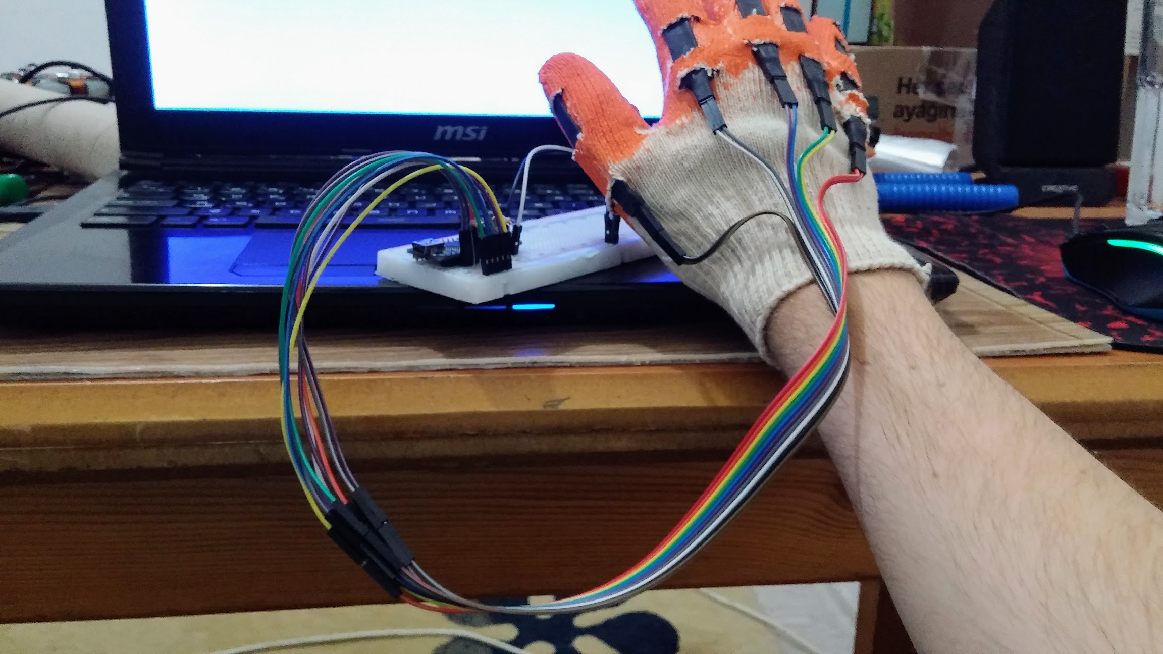 5 sensörü yaptıktan sonra sıra eldivene geldi. Evde kullanmadığımız bir inşaat eldiveni buldum, “Bu işe yarar” dedim. Her parmağa birer sensör diktim. Dikiş işini annem görse bayılırdı herhalde ama ben elimden geleni yaptım. Sonuçta çalışması önemliydi güzel görünmesi değil.